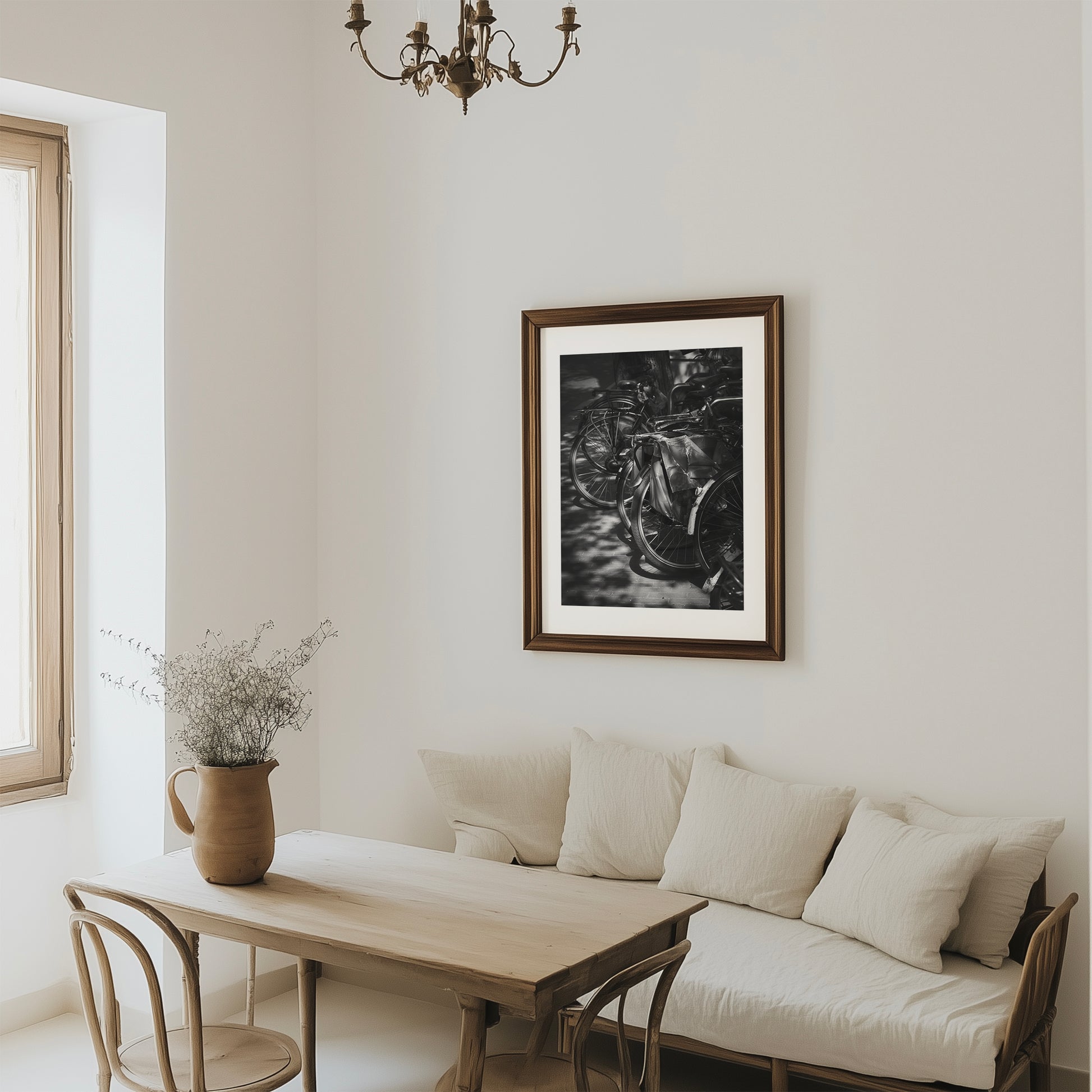 This elegant black and white print captures a close-up view of bicycle wheels in Amsterdam, highlighting the city's iconic cycling culture with a refined, fine-art aesthetic. Its striking composition and timeless monochrome palette make it a sophisticated addition to any interior, perfect for those who appreciate subtle yet impactful visual storytelling.