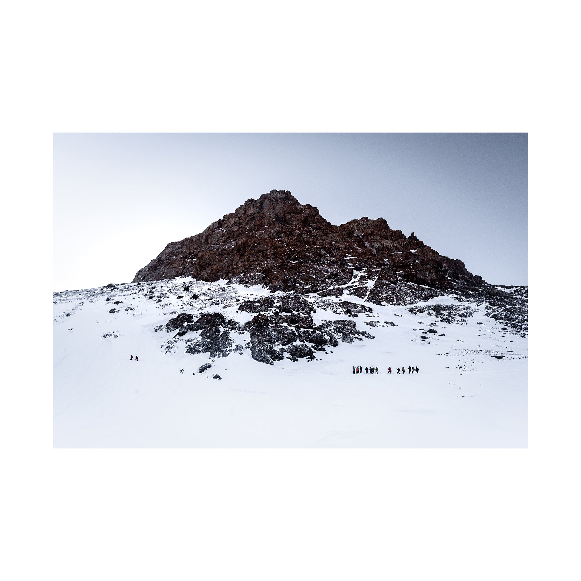 Capturing the majestic ascent of Mount Toubkal this print showcases the mountain range blanketed in deep snow, as climbers and guides attempt to wade through. This print highlights the enormity of the terrain leading up to the summit.