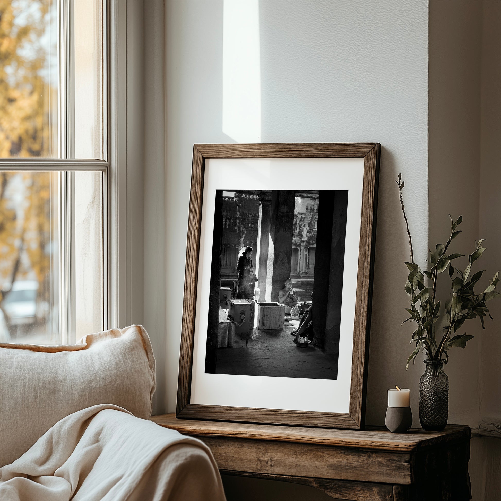 This elegant print captures a candid moment at Angkor Wat, Cambodia, where a woman gently burns incense as two monks take a quiet break, seeking relief from the heat. The image conveys a profound sense of tranquility and cultural depth, perfect for those who appreciate timeless, contemplative art.